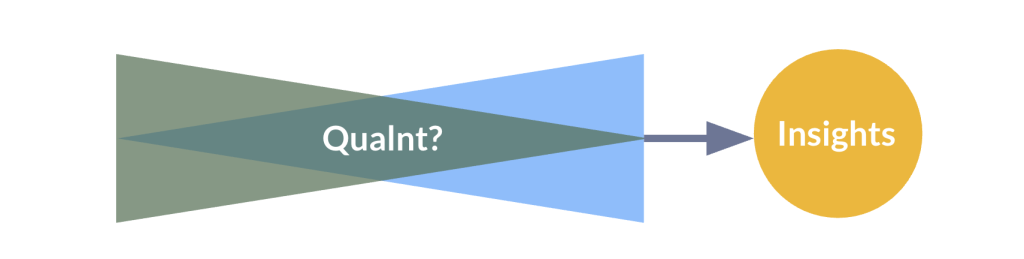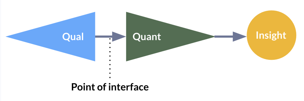The “point of interface” is the moment where a strand of qualitative work intersects with a strand of quantitative work. It’s useful because it’s a traceable moment where the goals and bounds of one research tradition give ownership over to another. Qualitative research is excellent at uncovering new things to count in human experiences, but poor at assessing scale to positivist standards. Quantitative research is excellent at assessing scale but lacks the nuance and fuzzy scope to uncover brand new things to count.